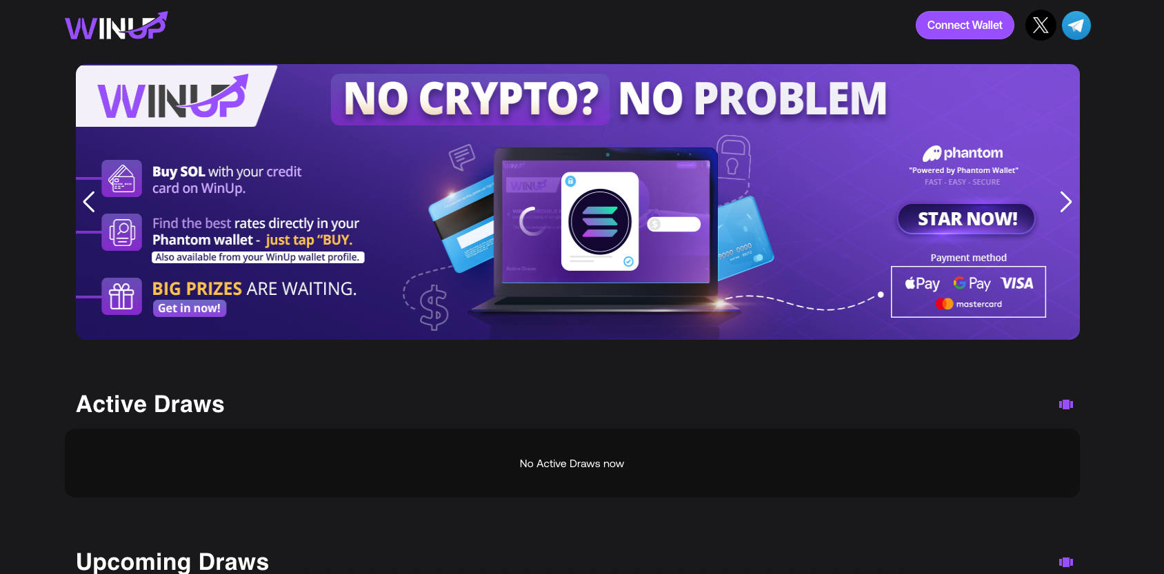 A Solana-based lottery/draws web platform where users connect wallets, buy tickets, and join USDT draws without KYC.